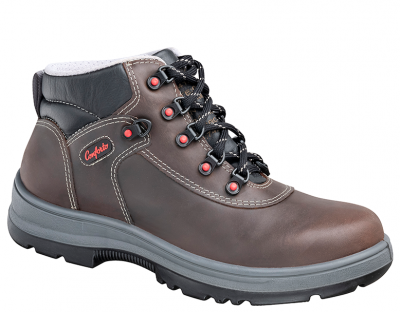Botina de segurança confeccionada em couro graxo, modelo amarrar e cano acolchoado em vaqueta com dois gomos. Ganchos em nylon ultra resistente, indeformável.