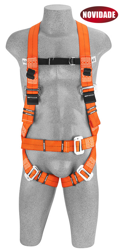 Cinto para-quedista em fita de poliéster, possui 1 argola dorsal em “D" para retenção de quedas, 2 anéis em fita frontal em “D” como ponto de ancoragem para subida e descida controlada.