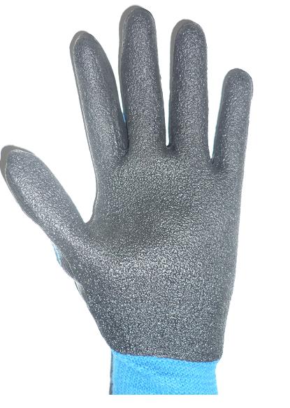 Luva tricotada em fios de poliamida e algodão azul revestida com borracha espumada preta na face palmar e pontas dos dedos.APLICAÇÕES