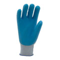 Luva de segurança, confeccionada em fios de algodão e poliéster, tricotada em uma só peça com revestimento externo em borracha natural na face palmar, acabamento em overloque e punho com elástico.