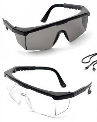 Óculos em policarbonato resistente a impactos e choques físicos de materiais sólidos e líquidos como: fragmentos de madeira, ferro, respingos de produtos ácidos, cáusticos, entre outros. Proteção contra raios UVA e UVB. Apoio nasal e proteção lateral no mesmo material da lente. Hastes tipo espátula com ajuste de comprimento para melhor adaptação ao rosto do usuário. Com tratamento anti-riscos. Abas laterais de proteção. Armação preta e hastes reguláveis. Acompanha cordão de segurança.