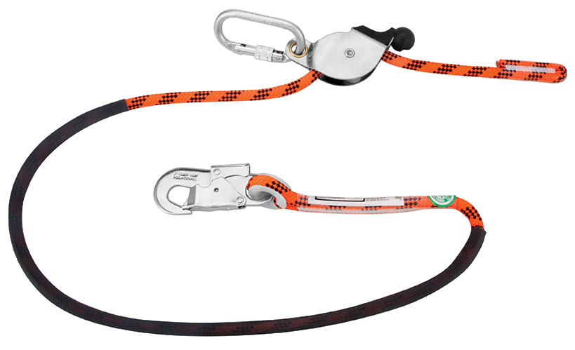 Talabarte em corda SEMIESTÁTICA de 12mm, protegida com fita de poliéster tubular emborrachado para evitar o desgaste da corda, 1 MOSQUETÃO DE 17mm de abertura com resistência de 25KN, 1 extremidade com dobra de costura reforçada. Regulador em INOX para aumentar ou reduzir o comprimento do talabarte.