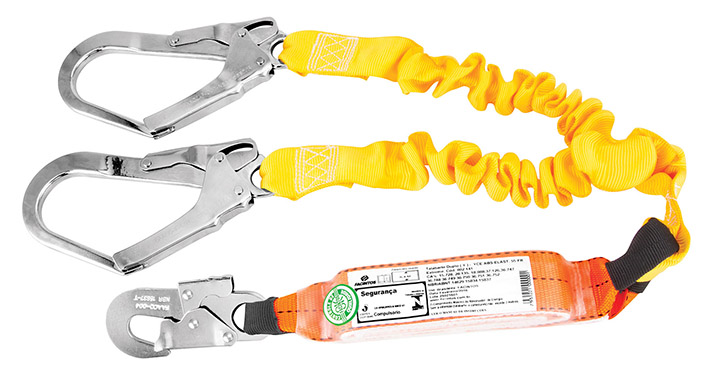 Talabarte em fita TUBULAR ELÁSTICO, com dupla conexão MOSQUETÕES DE 55 e 17mm de abertura com resistência de 25KN, Absorvedor de energia. Em caso de uma queda a força de impacto é reduzida a (4KN) ou menos.